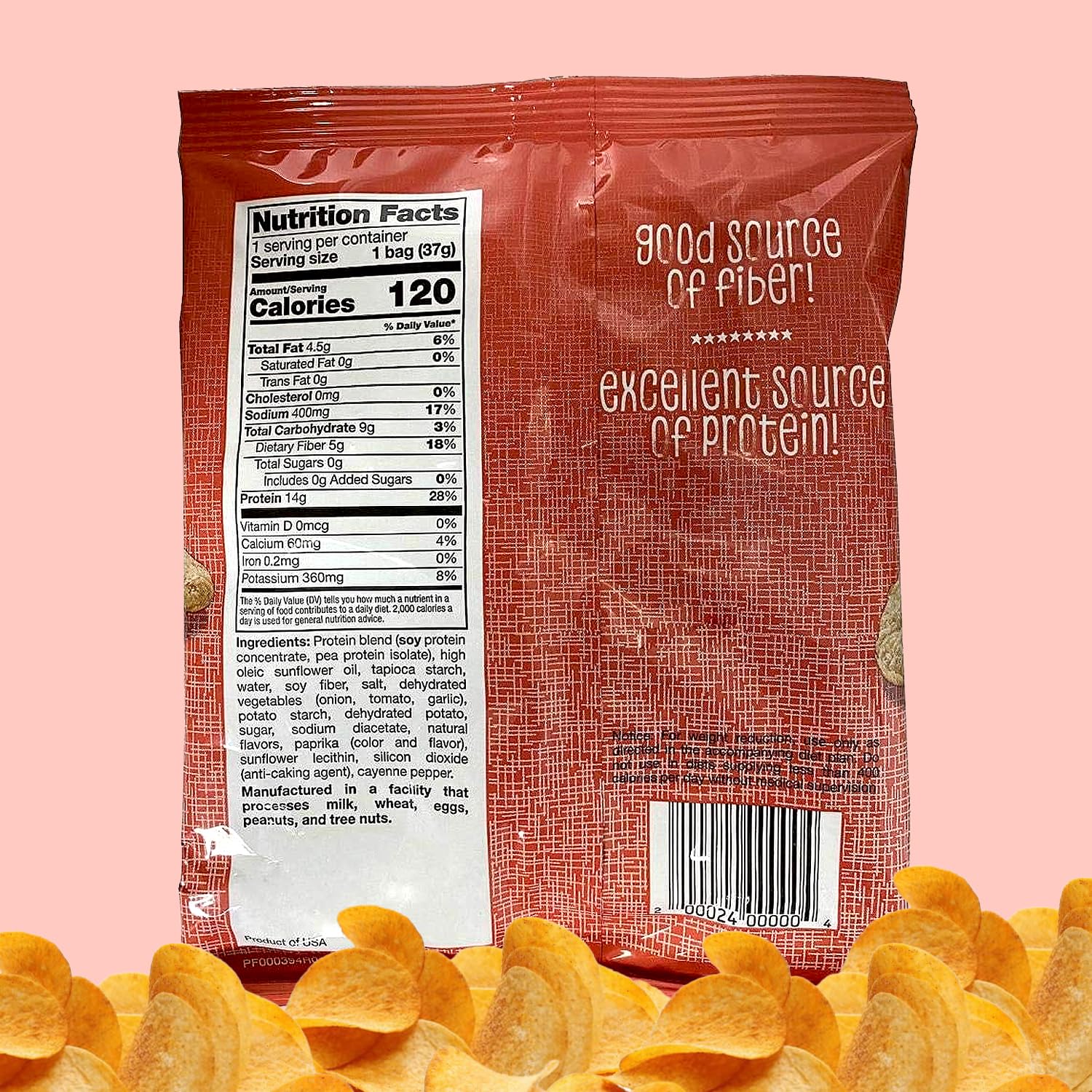 Ingredients: Chips (Soy Protein Concentrate, tapioca and potato starch, soy fiber, potato flakes, salt, sunflower lecithin), sunflower oil, dehydrated vegetables (Onion, garlic, tomato), sea salt, organic sugar, smoked paprika (Color & flavored), spices (Mustard, black pepper), natural mesquite smoke flavor. Manufactured in a facility that process milk.