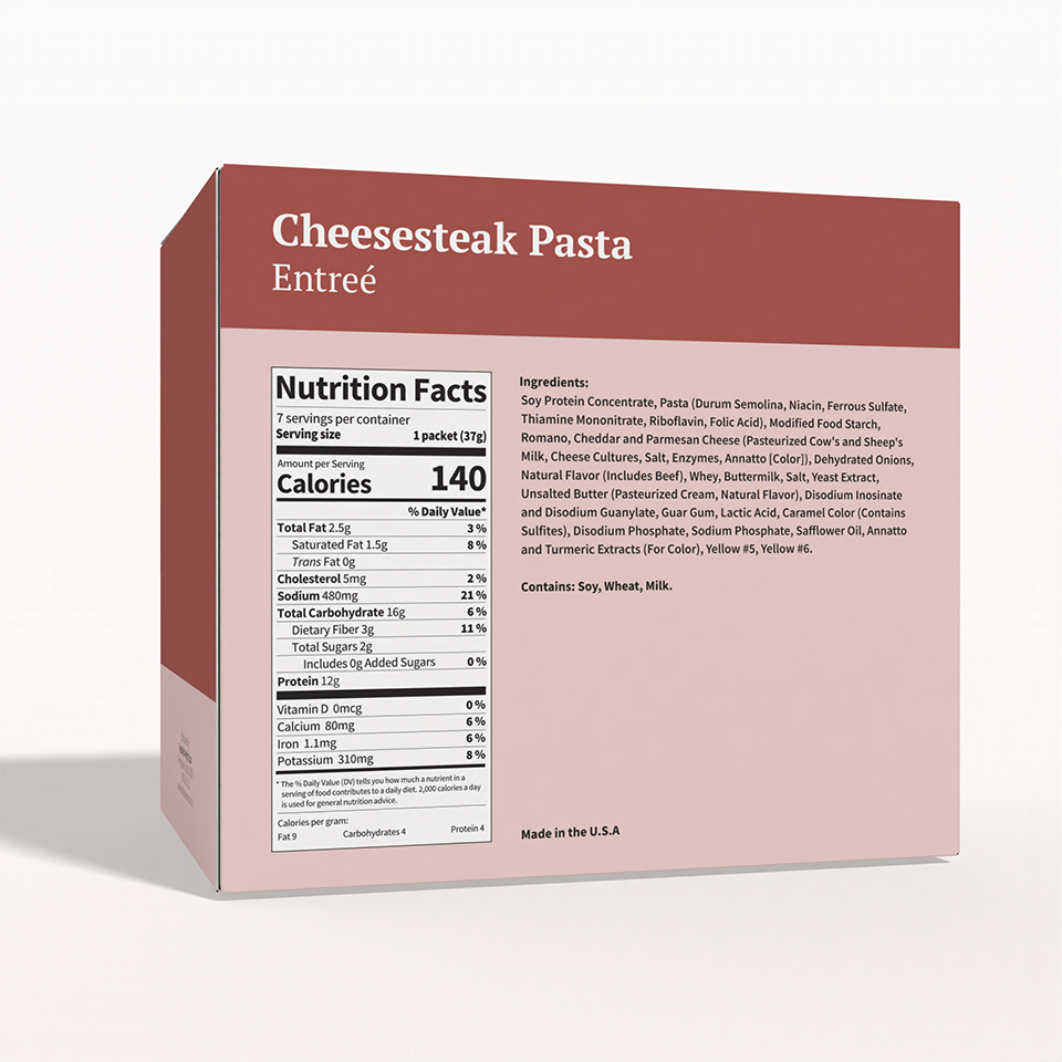 Enjoy the taste of Philly with BestMed's delicious Cheesesteak Pasta entree! Savor the flavor of three different kinds of cheese along with hearty beef while enjoying a healthy 12 grams of protein and only 140 calories. This single-serving entrée is perfect for packing in your bag for a quick lunch at work or indulging in a delicious, creamy dinner.