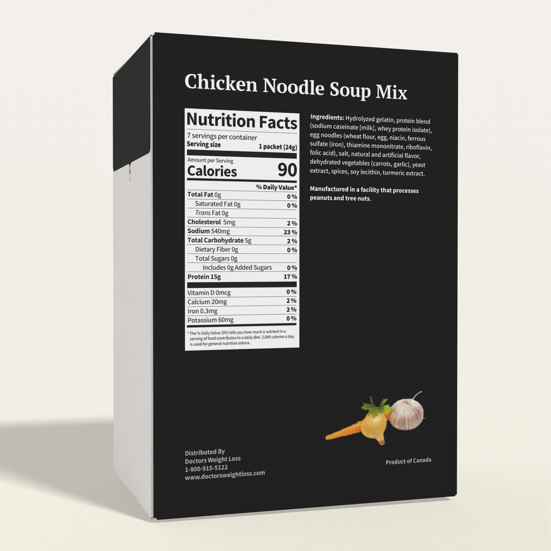 Ingredients: Hydrolyzed gelatin, protein blend (sodium caseinate [milk], whey protein isolate), egg noodles (durum wheat flour water, egg yolks, niacin, ferrous sulfate, thiamine mononitrate, riboflavin, folic acid), salt, natural and artificial flavors, dehydrated vegetables (carrot, garlic), yeast extract, spices and spice extracts, soy lecithin, turmeric extract (color). Manufactured in a facility that processes peanuts and tree nuts.