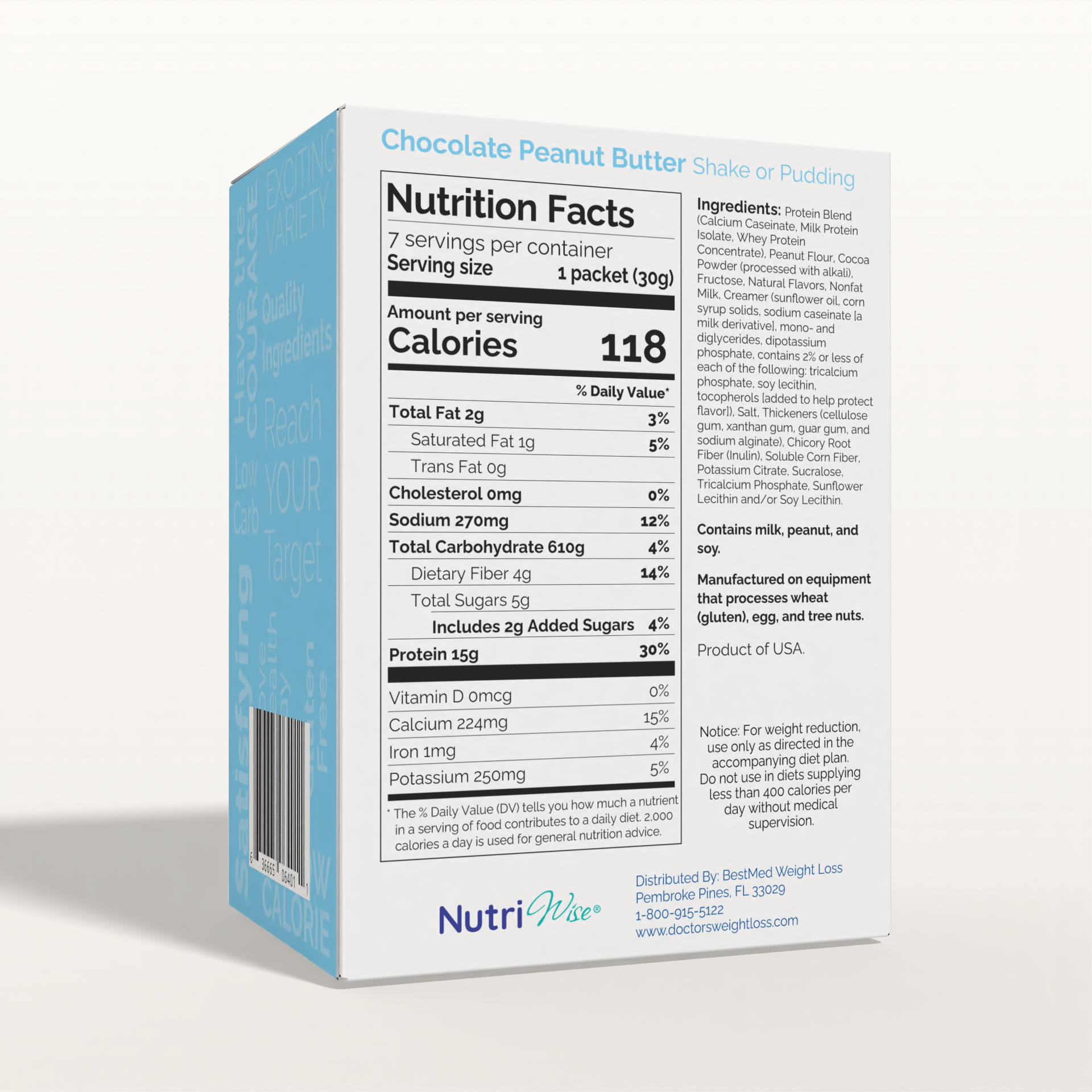 Craving a delicious, low calorie, high protein pudding and/or shake and still maintain your weight loss goals? Try the refreshing and creamy Chocolate Peanut Butter Pudding or Shake Mix with only 118 calories and 15 grams of protein. Enjoy a guilty pleasure without the guilt!