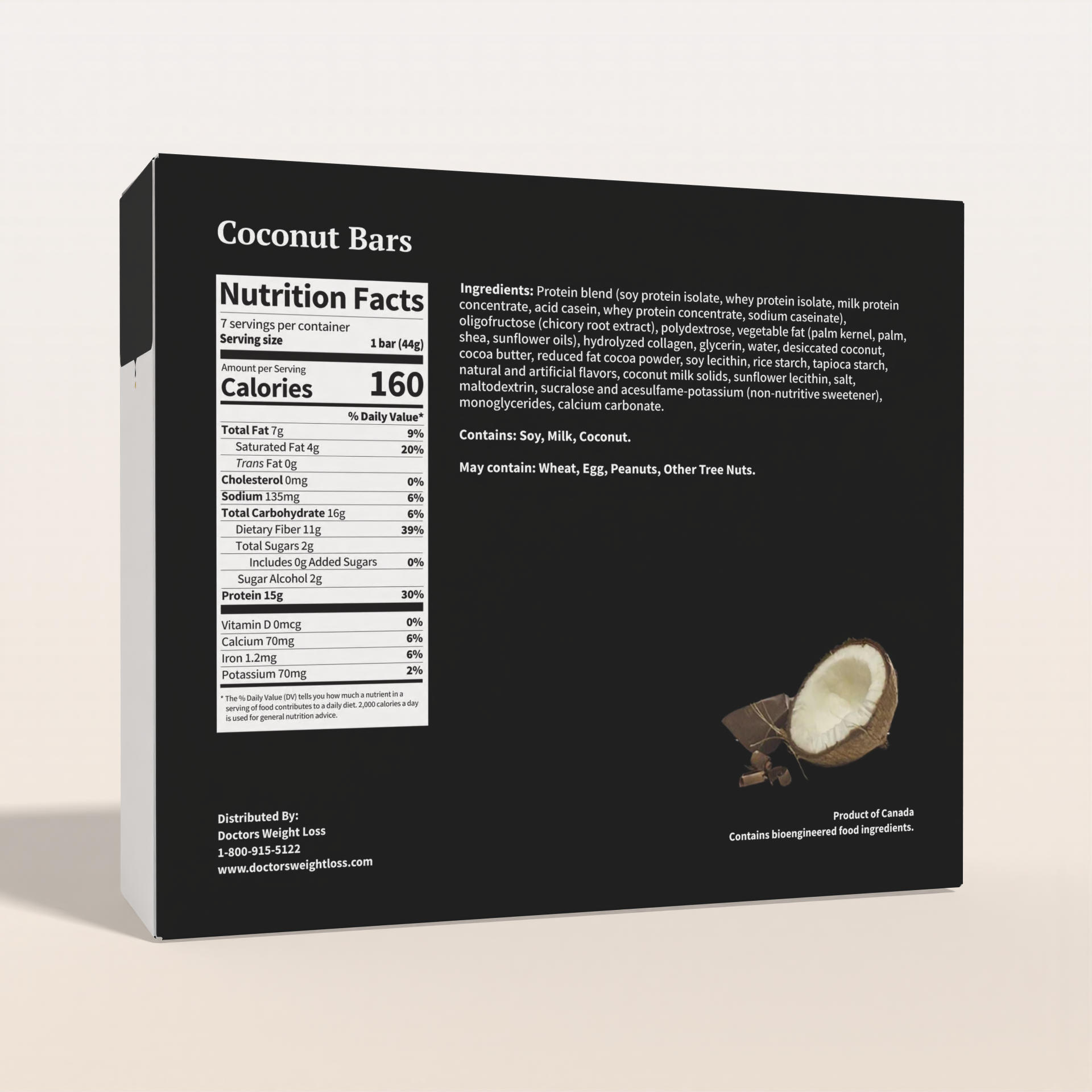 Ingredients: Protein blend (soy protein isolate, whey protein isolate, milk protein concentrate, acid casein, whey protein concentrate, sodium caseinate), polydextrose (contains 8 g per serving), oligofructose (chicory extract), vegetable oil (palm kernel oil, palm oil, shea oil), hydrolyzed gelatin, glycerin, sunflower oil, tapioca starch, coconut flakes, cocoa butter, soy lecithin, cocoa powder, natural and artificial flavours, coconut milk, salt, maltodextrin, monoglycerides, sucralose (contains 15 mg per serving), acesulfame-potassium (contains 7 mg per serving).Contains: milk, soy, egg, peanuts, tree nuts (coconut) and sesame.