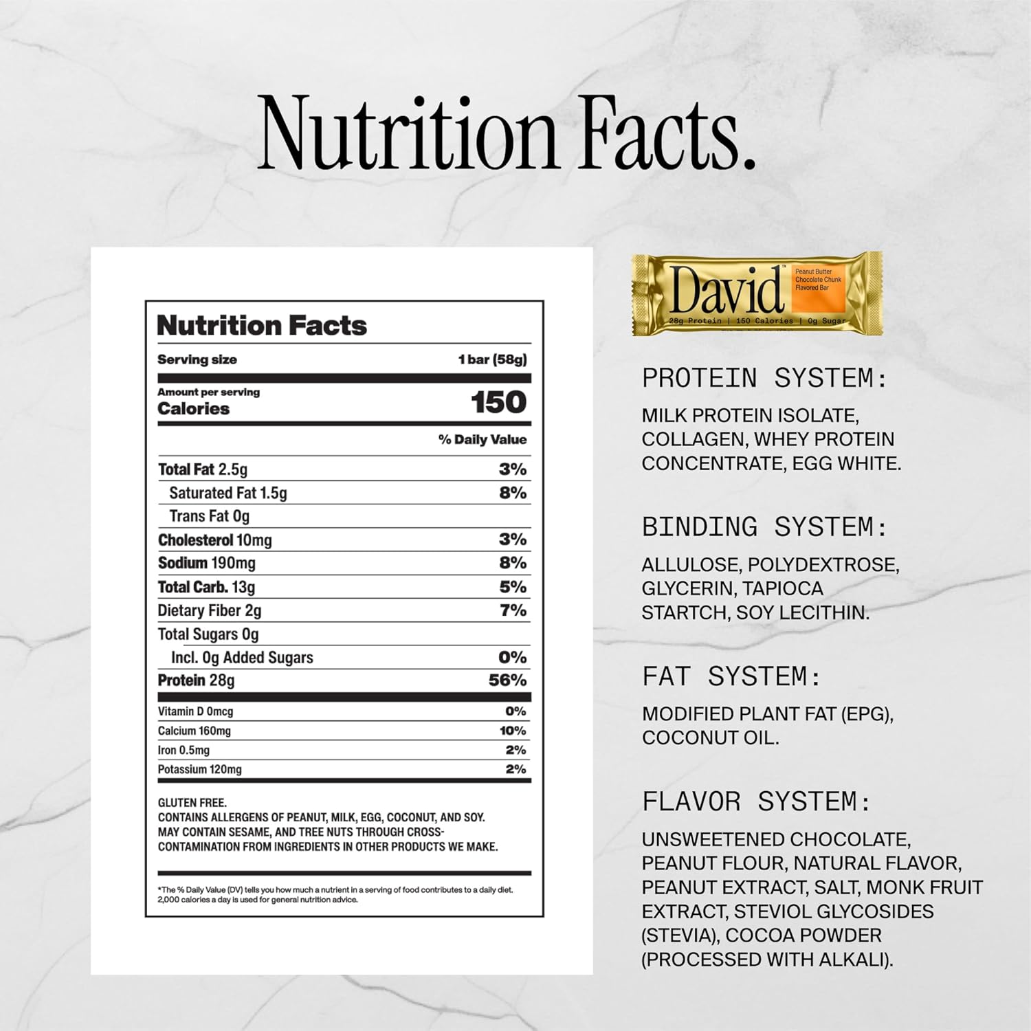 David has 28g of protein and only 150 calories. This is 75% CFP (CFP = Calories from Protein / Total Calories). The most protein-dense bar in existence. A diversity of protein sources comes together for a perfect 1.0 protein digestibility-corrected amino acid score (PDCAAS), meaning this protein is the best amino acid profile for both muscle building and optimal bodily functioning (including skin, hair, and nail health).