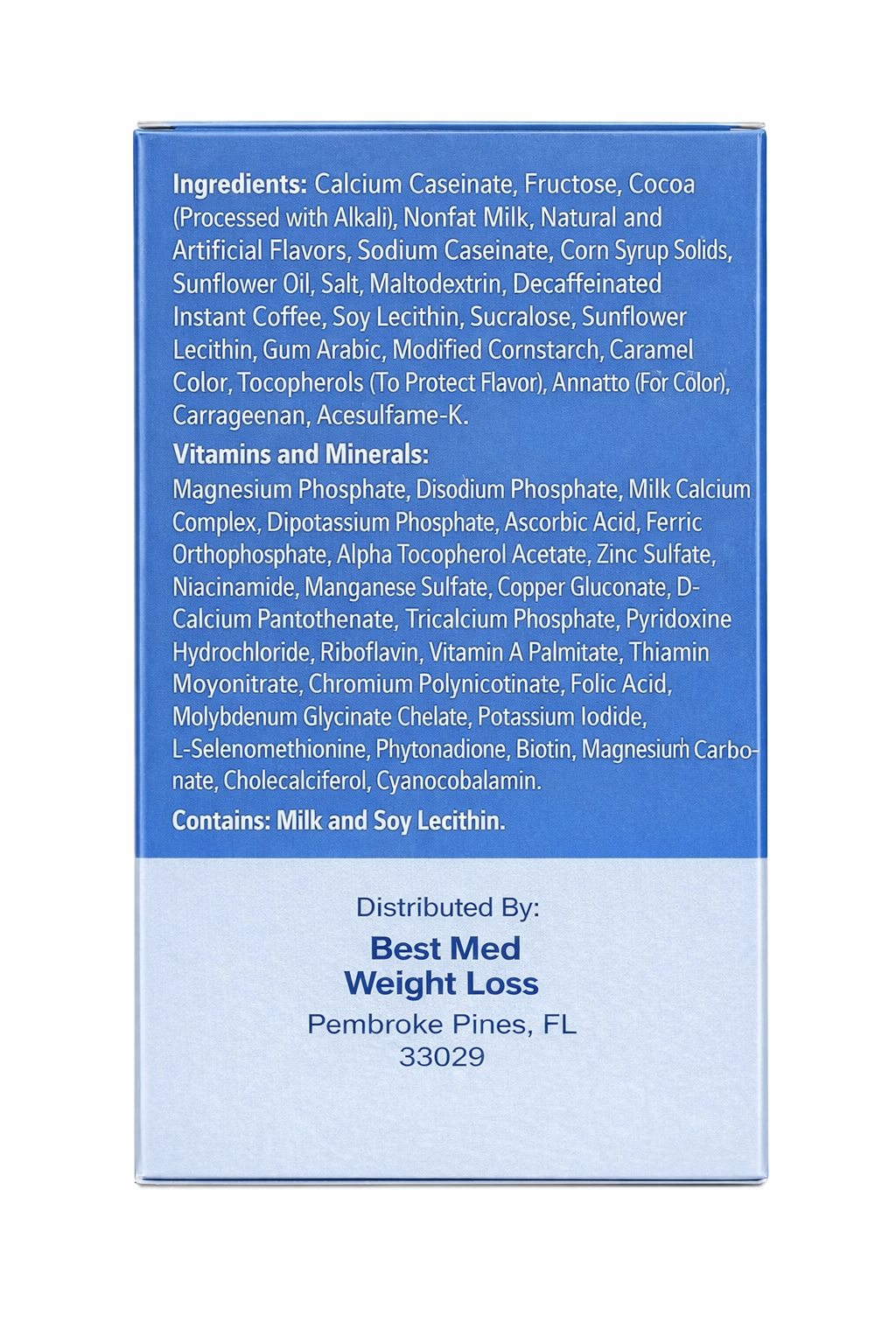 Ingredients: Calcium Caseinate (From Milk), Fructose, Cocoa (Processed With Alkali), Nonfat Milk, Natural and Artificial Flavors, Sodium Caseinate, Corn Syrup Solids, Sunflower Oil, Magnesium Phosphate, Salt, Disodium Phosphate, Maltodextrin, Dipotassium Phosphate, Decaffeinated Instant Coffee, Soy Lecithin, Sucralose, Gum Arabic, Vitamin C, Caramel Color, Modified Cornstarch, Tocopherol (To Protect Flavor), Ferric Orthophosphate, Carrageenan, Zinc Sulfate, Vitamin E (Alpha Tocopherol Acetate), Niacinamide, Acesulfame-K, Copper Gluconate, D-Calcium Pantothenate, Manganese Sulfate, Tricalcium Phosphate, Vitamin A Palmitate, Pyridoxine Hydrochloride, Riboflavin, Thiamin Mononitrate, Chromium Nicotinate Glycinate Chelate, Folic Acid, Molybdenum Glycinate Chelate, Selenium Glycinate Complex, Microcrystalline Cellulose, Biotin, Potassium Iodide, Vitamin K (Phytonadione), Magnesium Carbonate, Vitamin D3, Vitamin B12 (Cyanocobalamin).
