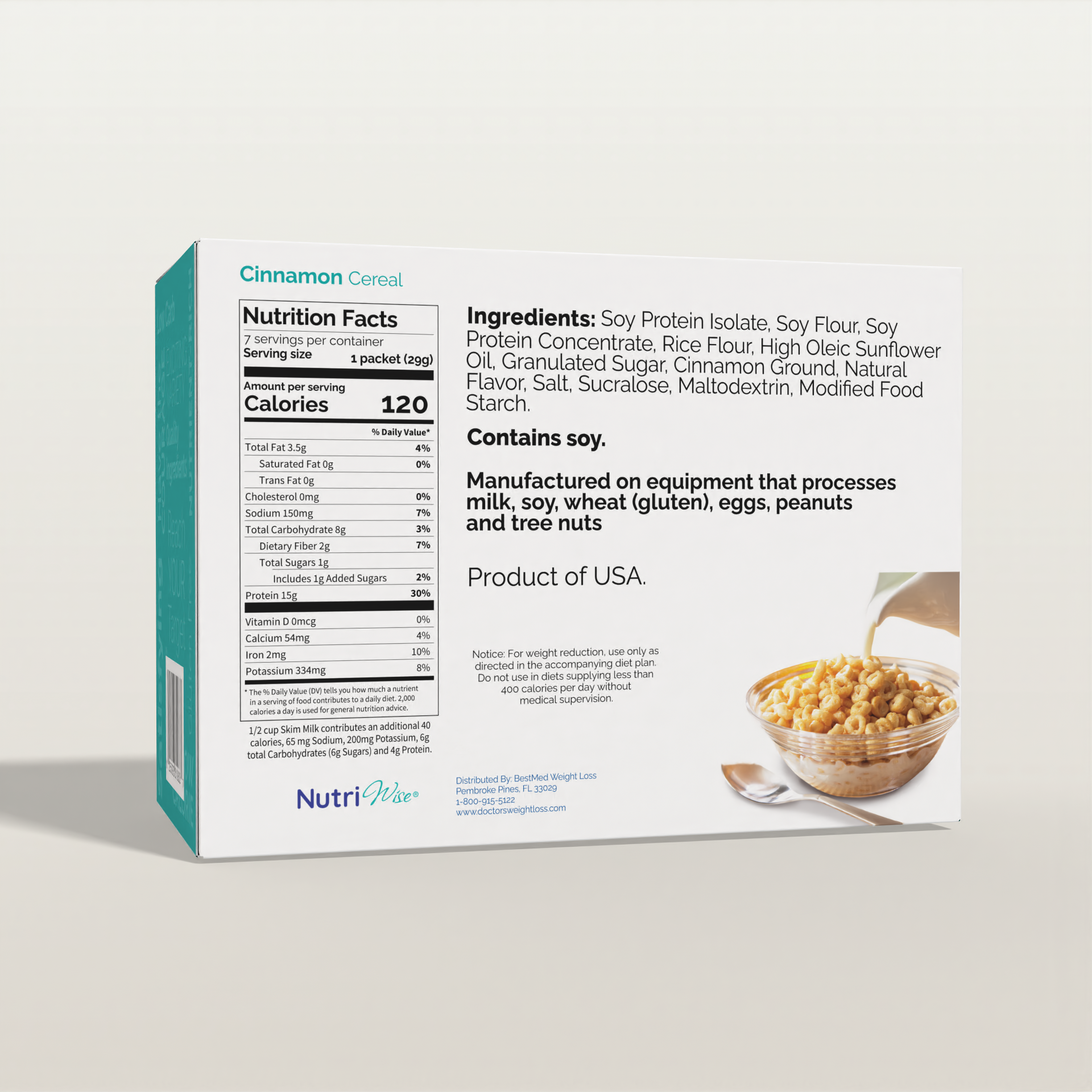 - Servings per box: 7 packets of NutriWise Cinnamon Protein Cereal