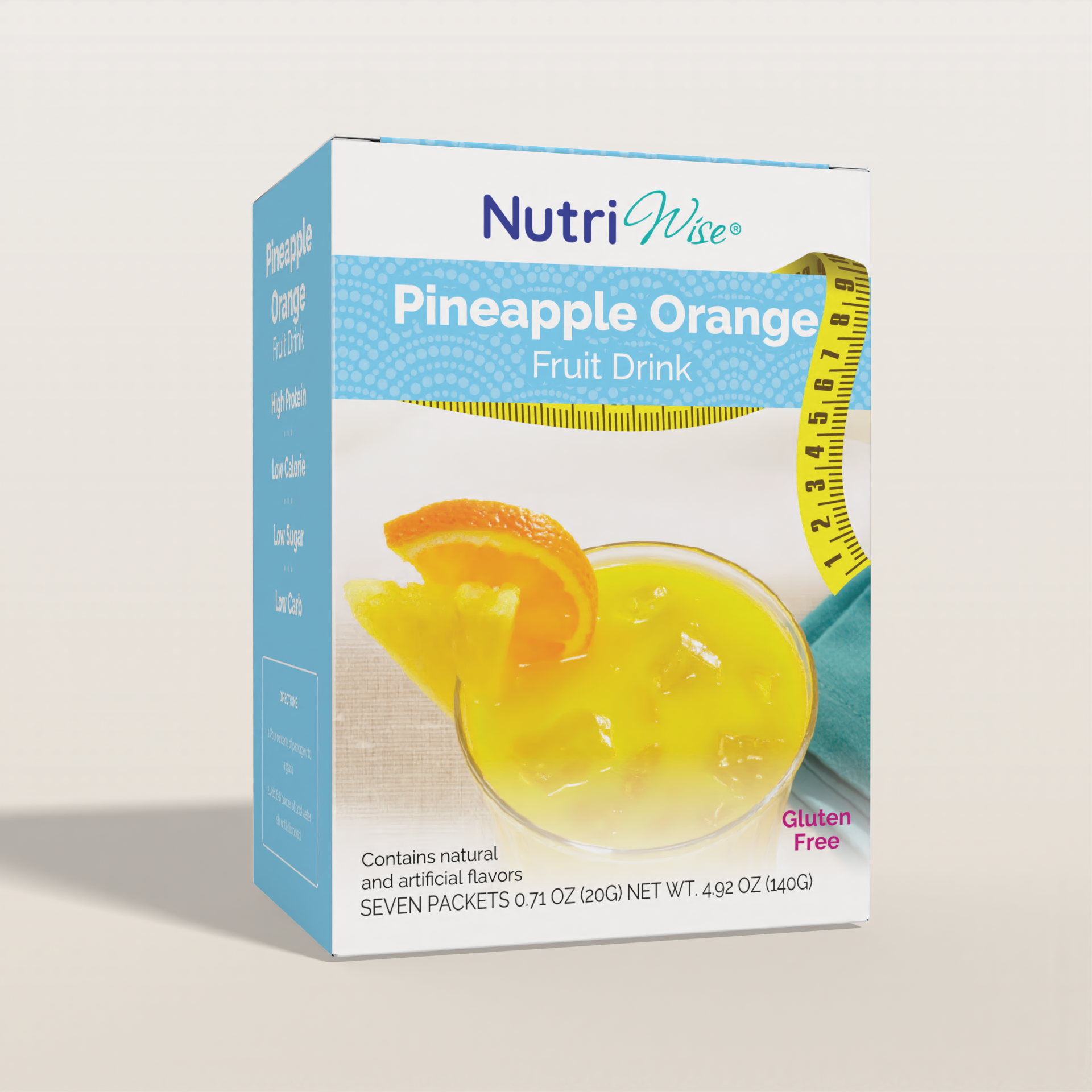 - Pour one serving of NutriWise Pineapple Orange Drink Mix into a glass.