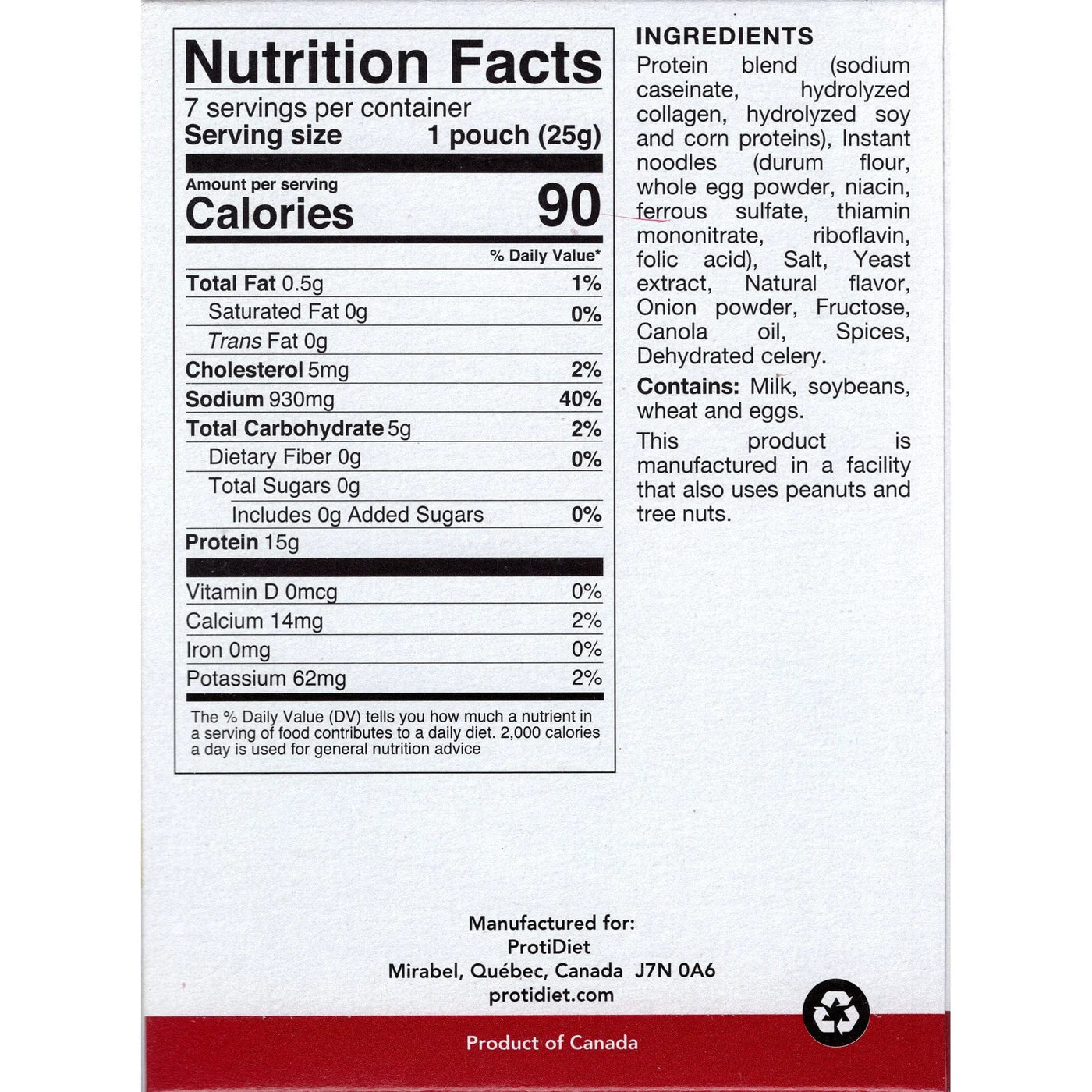 Ingredients: Protein blend (calcium caseinate, hydrolyzed gelatin, hydrolyzed corn and soy proteins), Instant noodles (durum flour, whole egg powder, niacin, ferrous sulfate, thiamin mononitrate, riboflavin, folic acid), Salt, Yeast extract, Natural flavor, Onion powder, Fructose, Canola oil, Spices, Celery extract. Contains: Milk, wheat, egg, soybeans. This product is manufactured in a facility that uses peanuts and tree nuts.