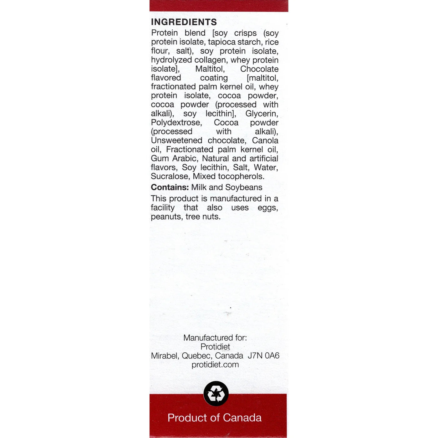 Ingredients: Soy Nuggets, (Soy Protein Isolate, Tapioca Starch, Salt), Maltitol Syrup, Chocolate Coating (Maltitol, Palm Kernel Oil, Whey Protein Hydrolysate, Cocoa Powder processed with Alkali, Cocoa Powder, Sugar, Palm Oil, Soy Lecithin, Natural and Artificial Flavor, Sucralose), Glycerin, Soy Protein Isolate, Hydrolyzed Gelatin, Polydextrose, Chocolate Liquor, Canola Oil, Cocoa Powder processed with Alkali, Whey Protein Isolate, Fractionated Palm Kernel Oil, Arabic Gum, Cocoa Powder, Natural and Artificial Flavor, Soy Lecithin, Natural Flavor, Salt, Water, Sucralose, Mixed Tocopherols. ALLERGY INFORMATION: CONTAINS: SOYBEANS AND MILK. THIS PRODUCT IS MANUFACTURED IN A FACILITY THAT USES PEANUTS, WHEAT, EGG, OTHER NUTS AND SEEDS.