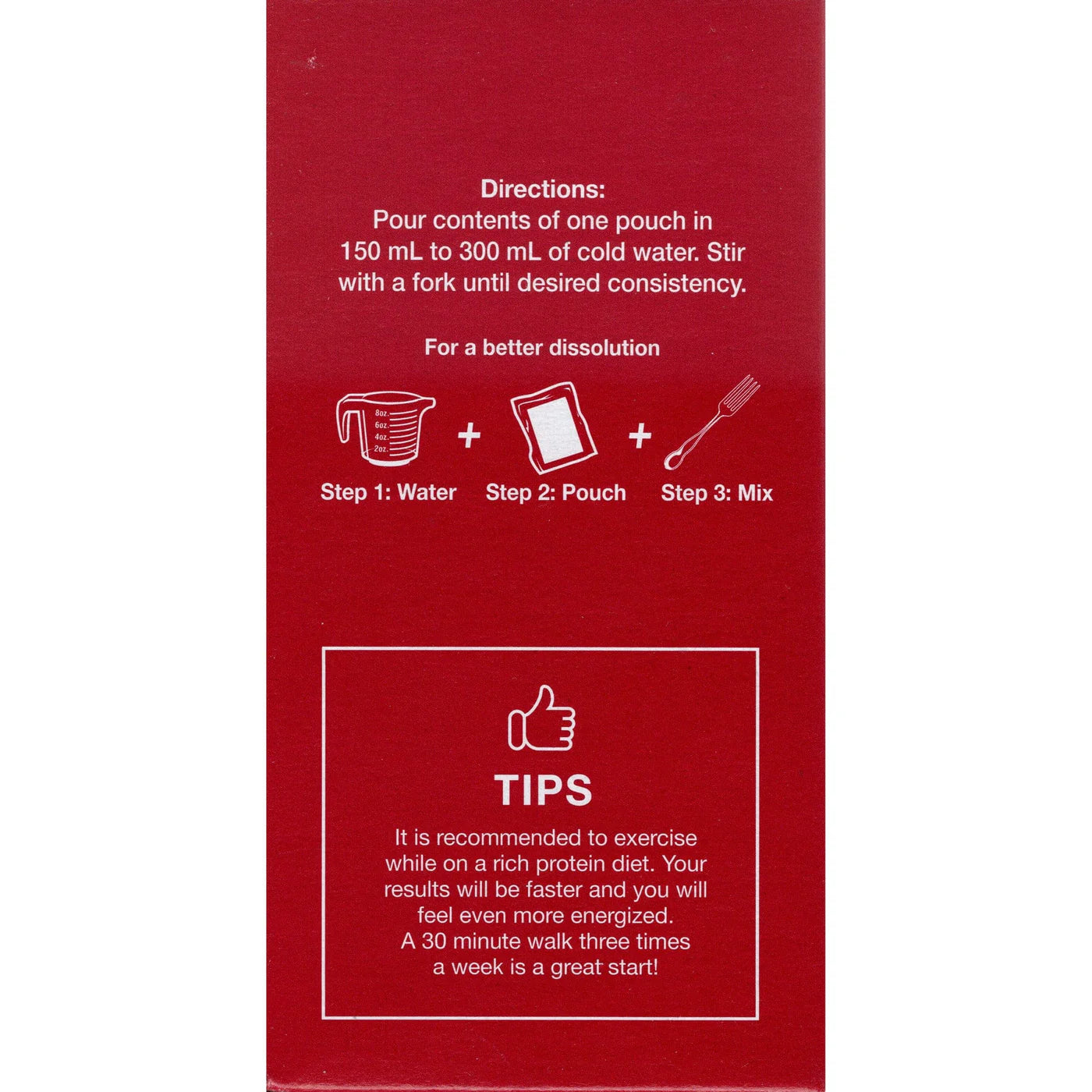 - Add the contents of one pouch to 5 ounces of cold water.