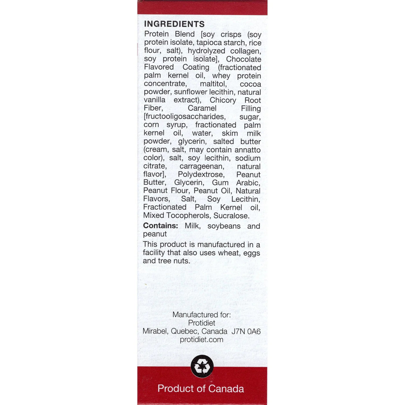 Ingredients: Protein Blend (Soy Crisps [Soy Protein Isolate, Tapioca Starch, Rice Flour, Salt], Hydrolyzed Collagen, Soy Protein Isolate), Chocolate Flavored Coating (Fractionated Palm Kernel Oil, Whey Protein Concentrate, Maltitol, Cocoa Powder, Sunflower Lecithin, Natural Vanilla Extract), Chicory Rood Fiber, Caramel Filling (Fructooligosaccharides, Sugar, Corn Syrup, Fractionated Palm Kernel Oil, Water, Skim Milk Powder, Glycerin, Salted Butter [Cream, Salt, May Contain Annatto Color], Salt, Soy Lecithin, Sodium Citrate, Carrageenan, Natural Flavor), Polydextrose, Peanut Butter, Glycerin, Gum Arabic, Peanut Flour, Peanut Oil, Natural Flavors, Salt, Soy Lecithin, Fractionated Palm Kernel Oil, Mixed Tocopherols, Sucralose. Contains: Milk, soybeans and peanuts. This product is manufactured in a facility that also uses wheat, eggs and tree nuts.