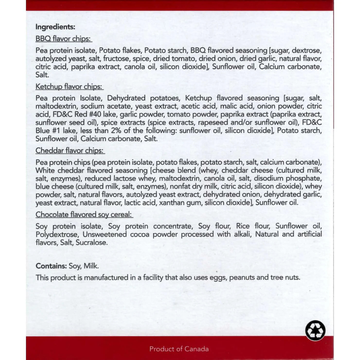 Ingredients: BBQ flavor chips: Pea protein isolate, Potato flakes, Potato starch, BBQ flavored seasoning [sugar, dextrose, autolyzed yeast, salt, fructose, spice, dried tomato, dried onion, dried garlic, natural flavor, citric acid, paprika extract, canola oil, silicon dioxide], Sunflower oil, Calcium carbonate, Salt. Ketchup flavor chips: Pea protein isolate, Dehydrated potatoes, Ketchup flavored seasoning [sugar, salt, maltodextrin, sodium acetate, yeast extract, acetic acid, malic acid, onion powder, citric acid, FD&C Red #40 lake, garlic powder, tomato powder, paprika extract (paprika extract, sunflower seed oil), spice extracts (spice extracts, rapeseed and/or sunflower oil), FD&C Blue #1 lake, less than 2% of the following: sunflower oil, silicon dioxide], Potato starch, Sunflower oil, Calcium carbonate, Salt. Cheddar flavor chips: Pea protein chips (pea protein isolate, potato flakes, potato starch, salt, calcium carbonate), White cheddar flavored seasoning [cheese blend (whey, cheddar cheese {cultured milk, salt, enzymes}, reduced lactose whey, maltodextrin, canola oil, salt, disodium phosphate, blue cheese {cultured milk, salt, enzymes}, nonfat dry milk, citric acid, silicon dioxide), whey powder, salt, natural flavors, autolyzed yeast extract, dehydrated onion, dehydrated garlic, yeast extract, natural flavor, lactic acid, xanthan gum, silicon dioxide], Sunflower oil. Chocolate flavored soy cereal: Soy protein isolate, Soy protein concentrate, Soy flour, Rice flour, Sunflower oil, Polydextrose, Unsweetened cocoa powder processed with alkali, Natural and artificial flavors, Salt, Sucralose. Contains: Soy, Milk. This product is manufactured in a facility that also uses eggs, peanuts and tree nuts.