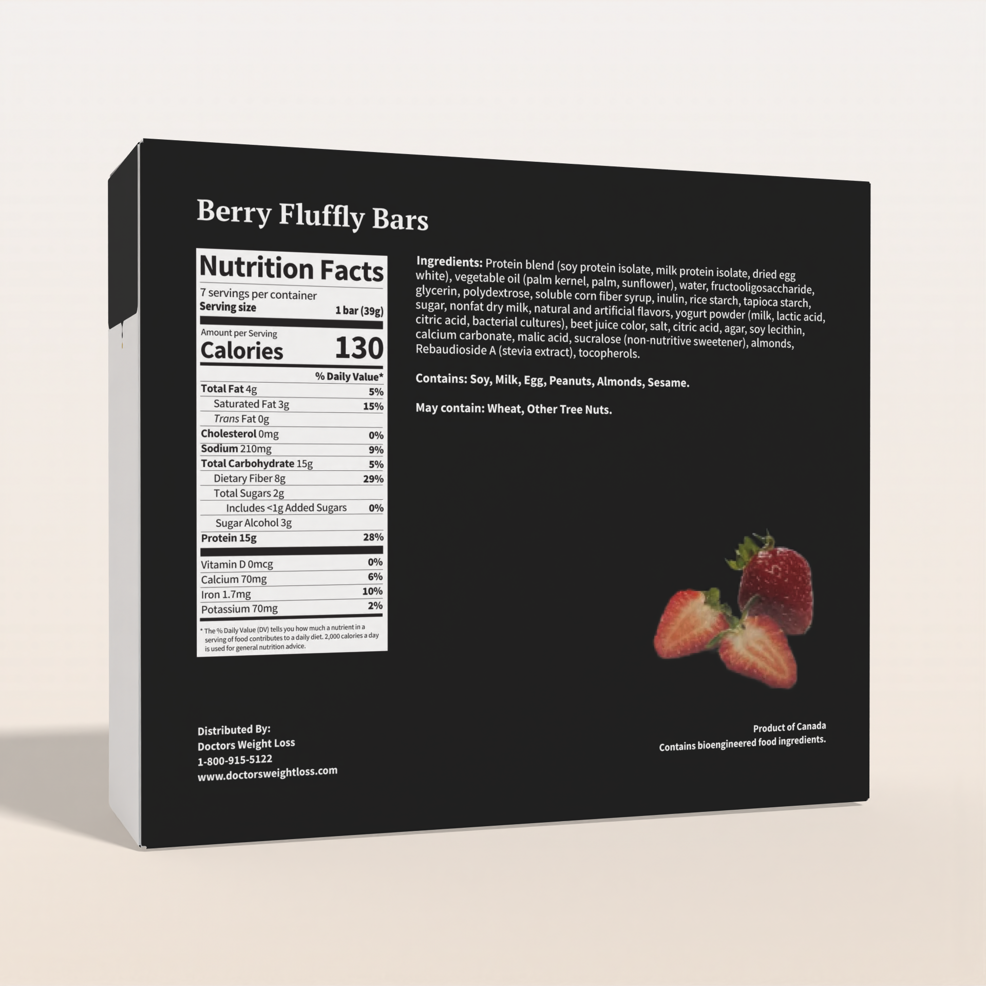 Ingredients: Protein blend ( soy protein isolate, whey protein isolate, milk protein concentrate, acid casein, whey protein concentrate), polydextrose, oligofructlose, ( chicory root extract), vegetable oil, (palm kernel, palm, shea, sunflower), Hydrolyzed collagen, glycerin, natural and artificial flavors, cocoa butter, rice starch, low fat cocoa powder, sunflower lecithin, pomegranate juice powder, cranberry juice concentrate powder, raspberry nuggets, (raspberry puree from concentrate, sugar, apple puree, pineapple fiber, natural flavor, citric acid, sodium alginate, dicalcium phosphate anhudrous, arthocyanin,) salt, beet juice color, sucralose and acesulfame-potassium (non-nutritive sweetener), mono and diglycerides, soy lecithin. Contains: soy, milk May contain: tree nuts , egg