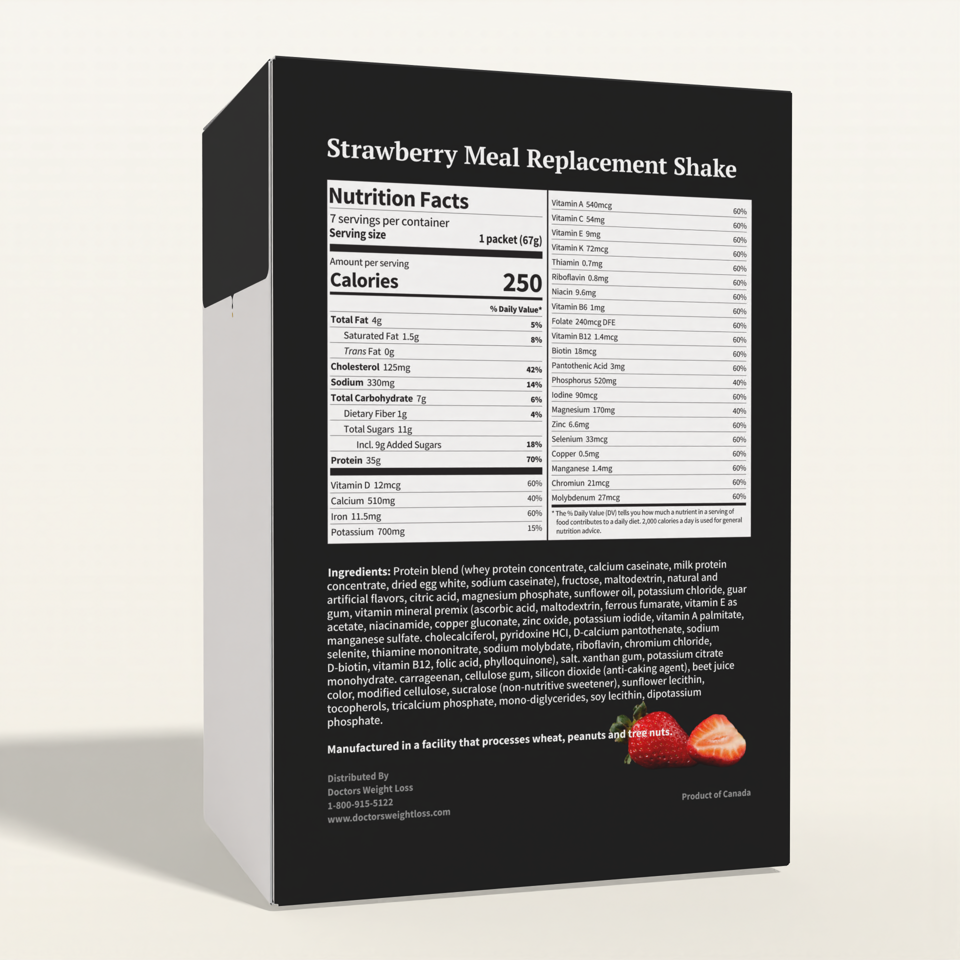 Ingredients: Protein blend (whey protein concentrate, milk proten isolate, calcium caselnate, sodium caseinate), fructose, maltodextrln, natural and artificial flavors, vitamin and mineral mix (magnesium carbonate, tricalcium phosphate, choline bitartate, dextrose, ascorbic acid, niacinamide, vitamin E as acetate, zinc sulfate, reduced iron, calcium Opaothenate, manganese sulfate, vitamin 86 as pyridoxine, vitamin B2 as riboflavin, vitamin B1 as thiamin mononitrate, cupric oxide, vitamin A as palmitate, folic acid, chromium chloride, D-biotin, sodium molybdate, potassium iodide, vitamin K1 as phytonadione, vitamin D3 as cholecalciferol, vitamin B12 as cyanocobalamin), citric acid, sunflower oil, guar gum, potassium chloride, salt, di potassium phosphate, xanthan gum, potassium citrate, carrageenan, cellulose gum, egg white powder, sunflower lecithin, soy lecithin, silicon dioxide, beet juice powder (color), cellulose, sucralose (non-nutritive sweetener), tocopherols, mono-diglycerides, canola oil. Manufactured in a facility that processes egg, soy, wheat, peanuts and tree nuts.